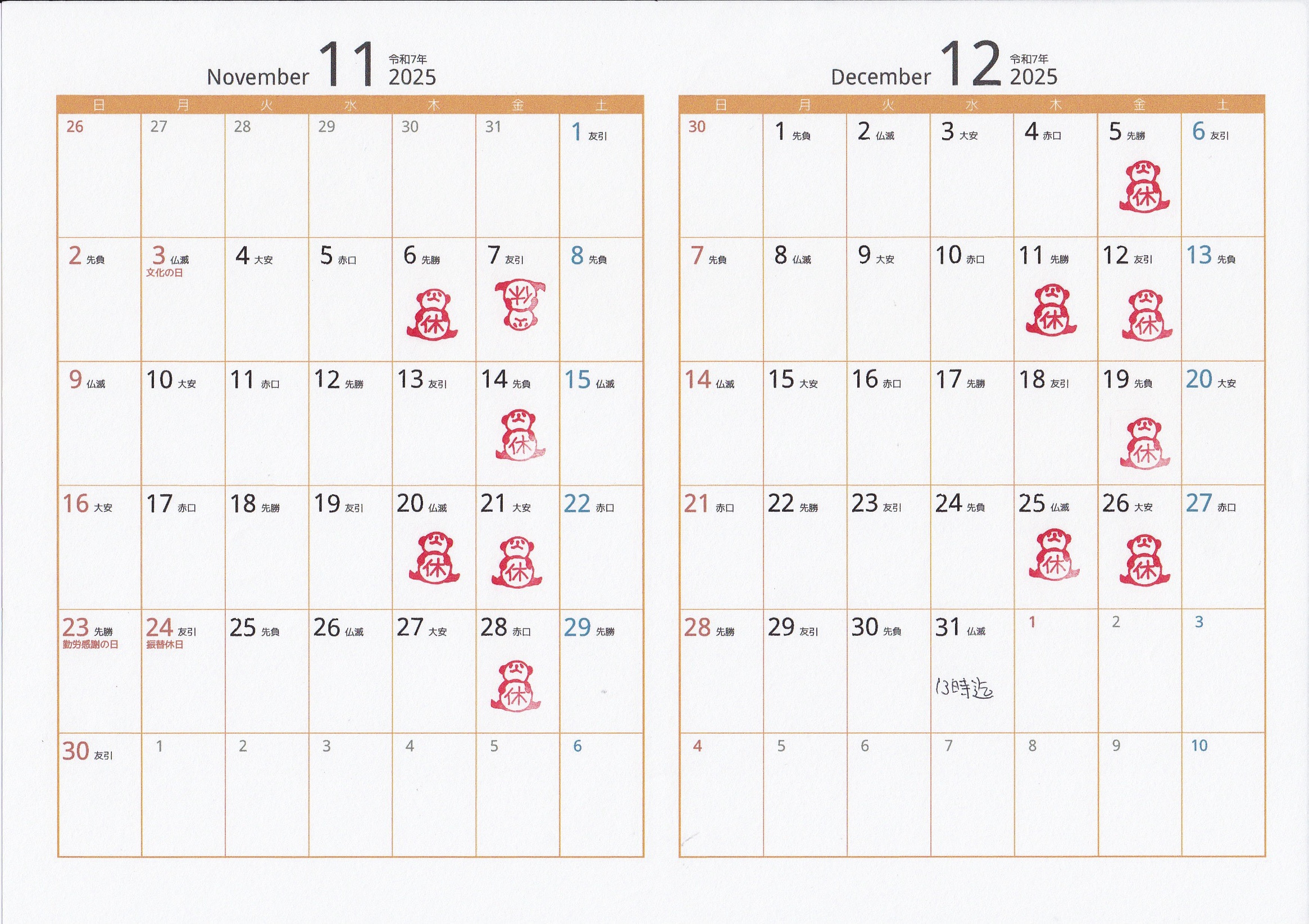 年内12/31は13時までの受け付けでございます。 正月休みは1/1〜1/5までを予定しています。 2026年1/6から営業開始します。 皆々様、お間違いのない様よろしくお願い申し上げます。